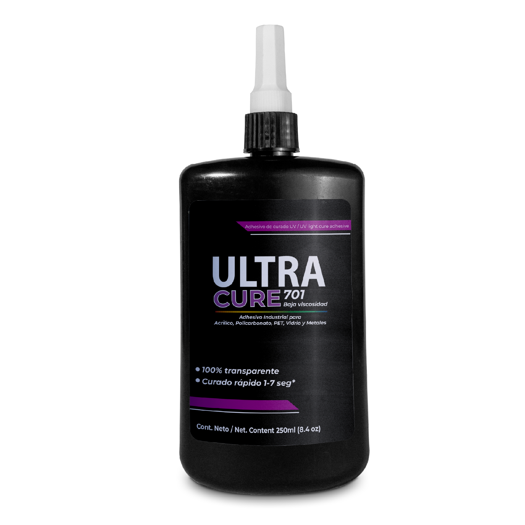 Adhesivo UV para pegar acrílico, policarbonato, PVC y PET, sin incluir agrietamiento por tensión. Proporciona una excelente adhesión a una variedad de otros sustratos, incluido el vidrio, plásticos y la mayoría de los metales. ULTRACURE 701 cura rápidamente cuando se expone a la luz ultravioleta. Su capacidad de curar en segundos, resulta en menores costos de procesamiento.