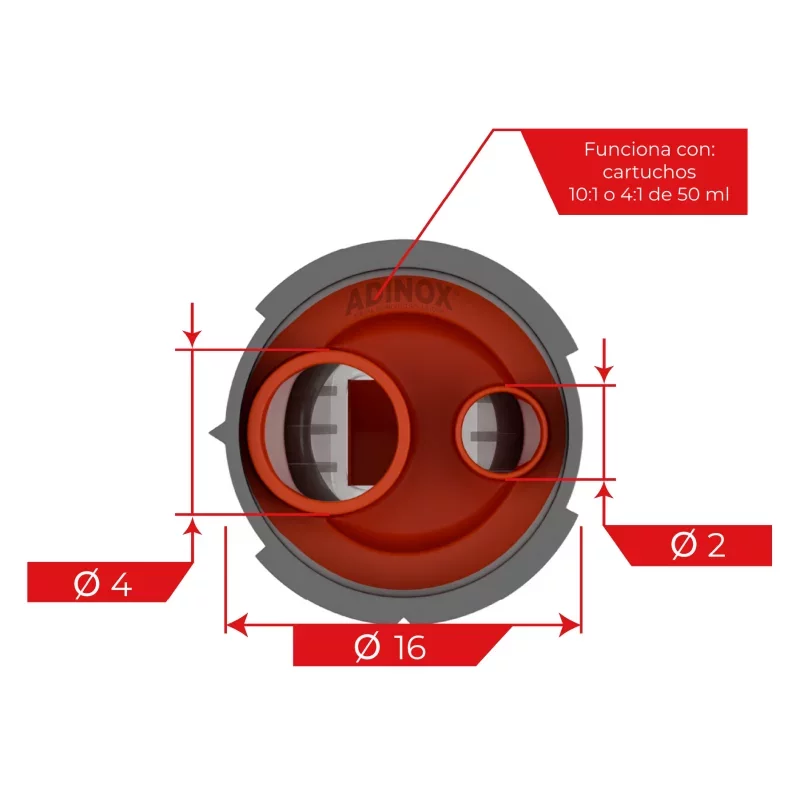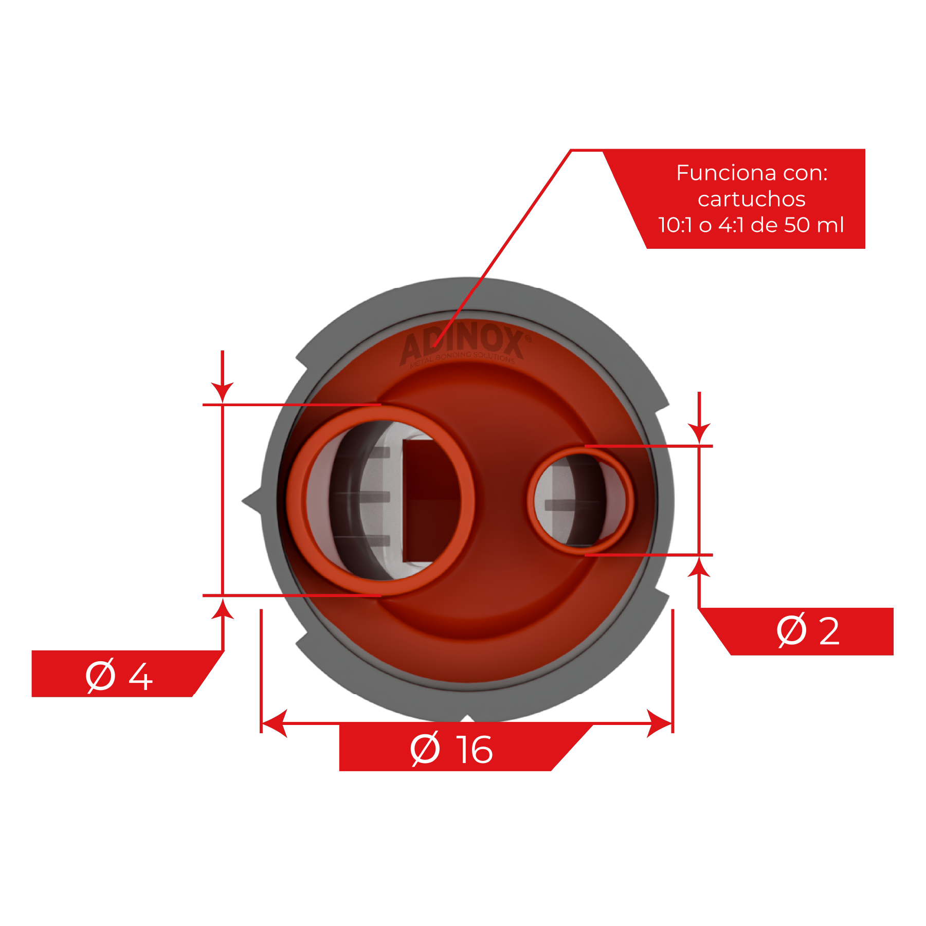 Boquilla mezcladora para cartuchos bicomponentes de 50 ml, 10:1. Tiene 24 elementos, una longitud de 4.37” y un diámetro interior de 5,3 mm.