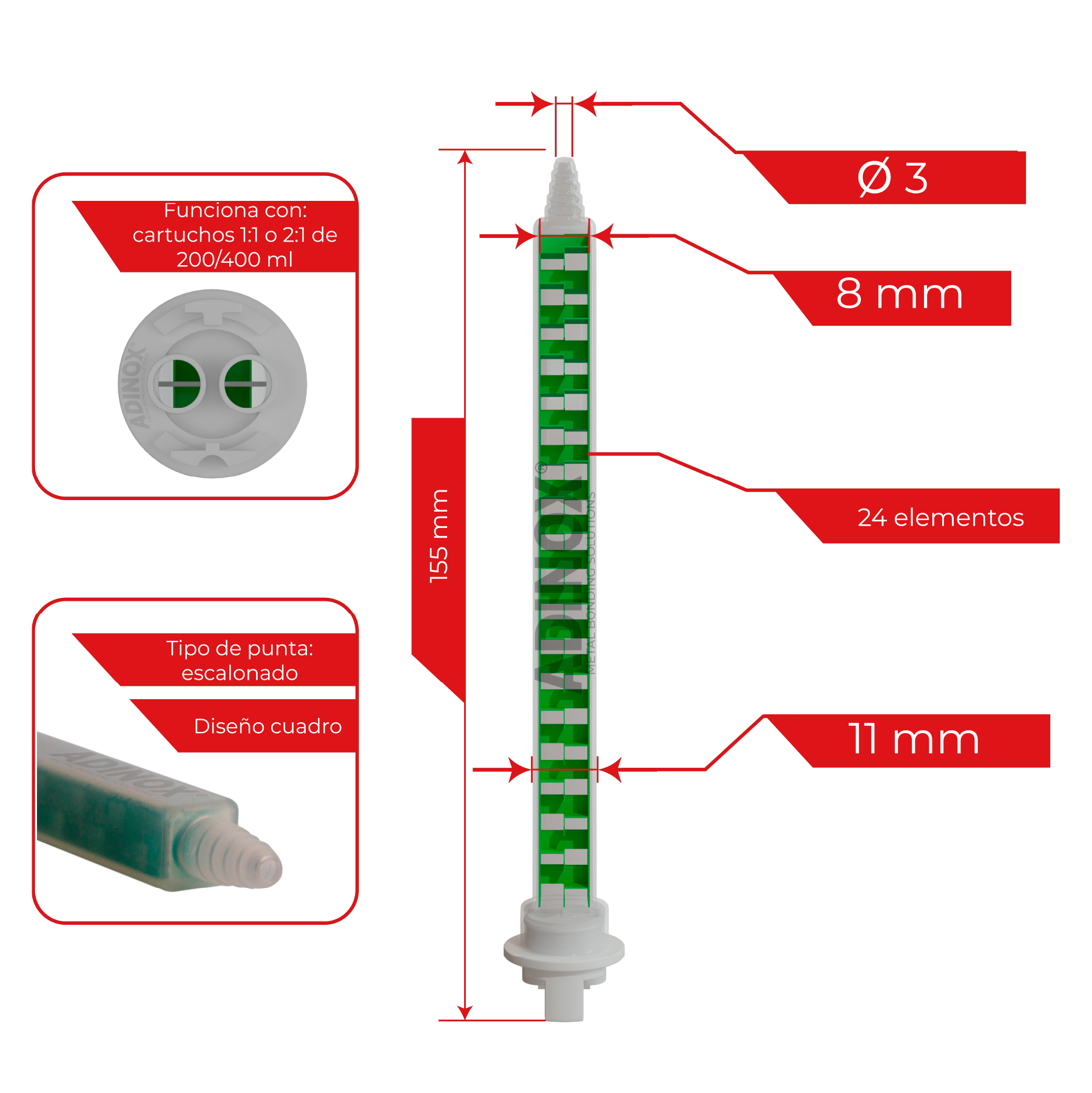 Boquilla mezcladora cuadrada, 24 elementos, relación 1:1 para cartuchos de 400 ml