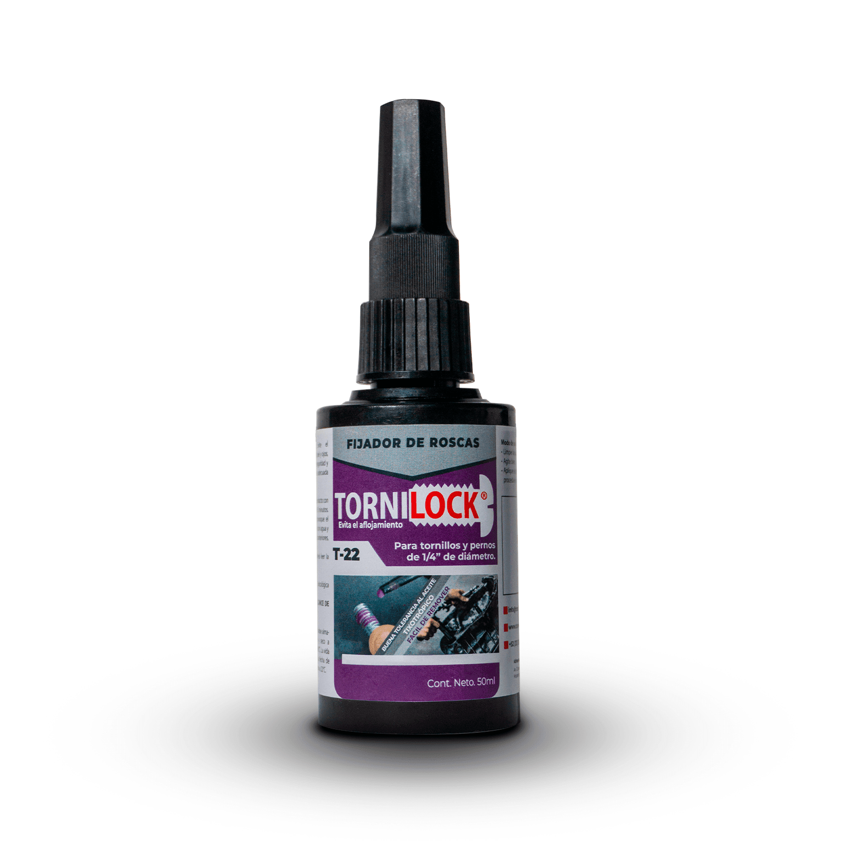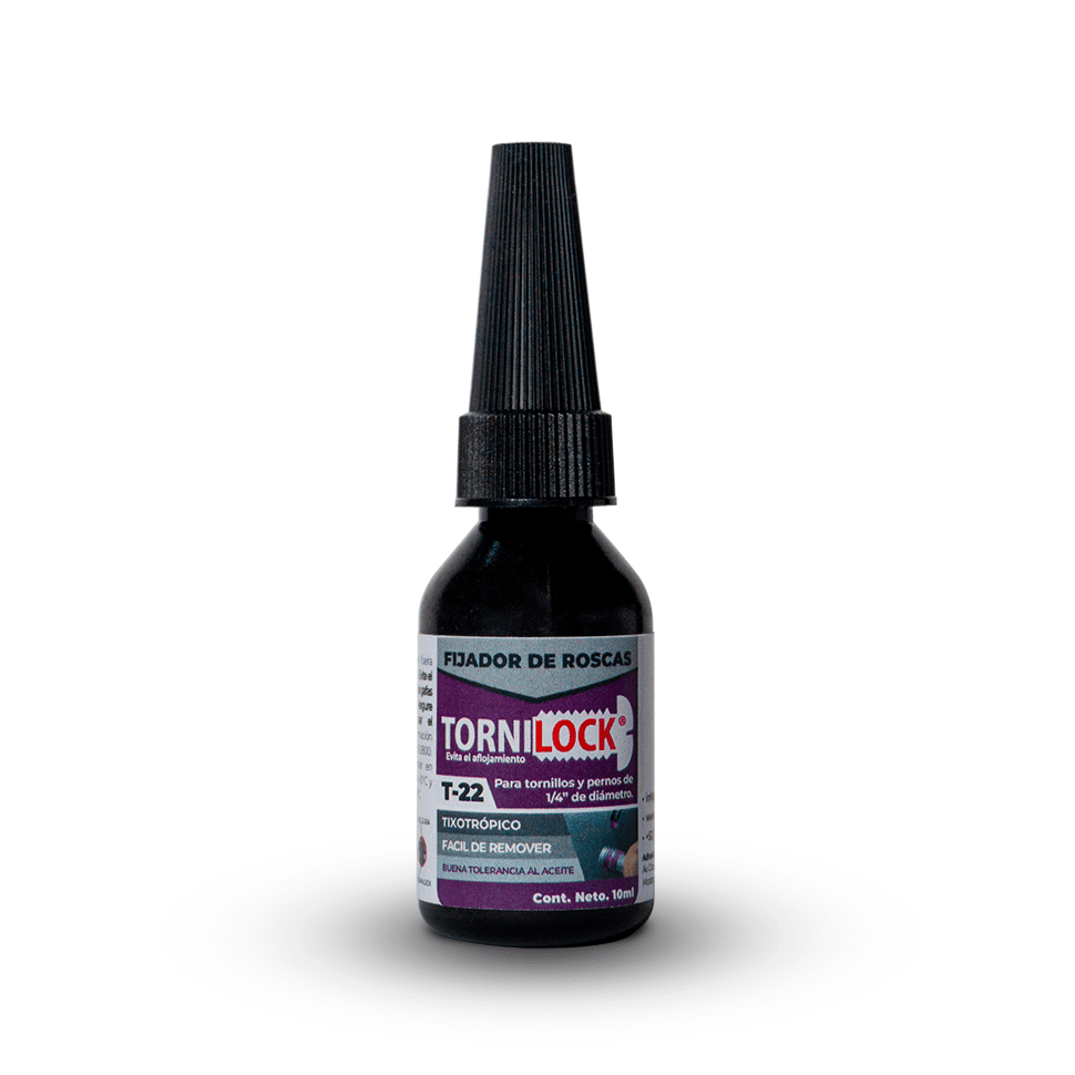 El fijador de tornillos T-22 de Tornilock es un adhesivo anaeróbico de baja resistencia diseñado para unir de forma segura y eficiente. Su fórmula tixotrópica rellena las holguras entre roscas metálicas, sella y previene el aflojamiento causado por vibraciones, impactos o expansión térmica. Su comportamiento lo hace apropiado para aplicaciones donde se requiere resistencia operativa, pero también posibilidad de desmontaje sin dañar el sustrato.