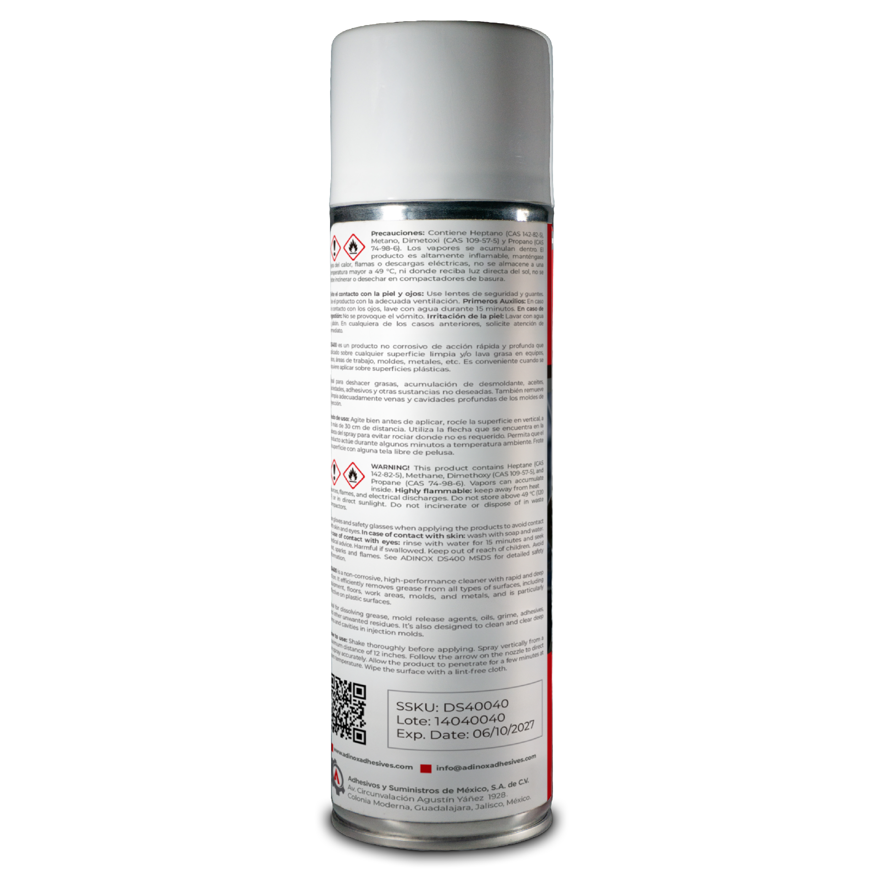 También remueve y limpia adecuadamente venas y cavidades profundas de los moldes de inyección. DS400 es un producto no corrosivo de acción rápida y profunda que espreado sobre cualquier superficie limpia y/o lava grasa en equipos, pisos, áreas de trabajo, moldes, partes de metal, aluminio, etc. Es conveniente cuando se requiere aplicar sobre superficies plásticas, hacer pruebas de comportamiento.
